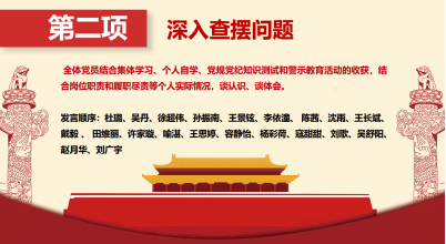 组织召开“严守纪律规矩、加强作风建设”专题组织生活会。9月23日晚19:00,开展由杜璐老师主持,公司党总支副书记唐曌堃全程督导,全体党员参加。组织生活会上,与会党员从“一、学习情况报告;二、深入查摆问题;三、开展批评与自我批评”三个方面,围绕个人如何遵守校规校纪、树立行为规范、营造优良学风等方面进行自我剖析,列问题清单,提整改措施,积极践行自我革命基本要求。