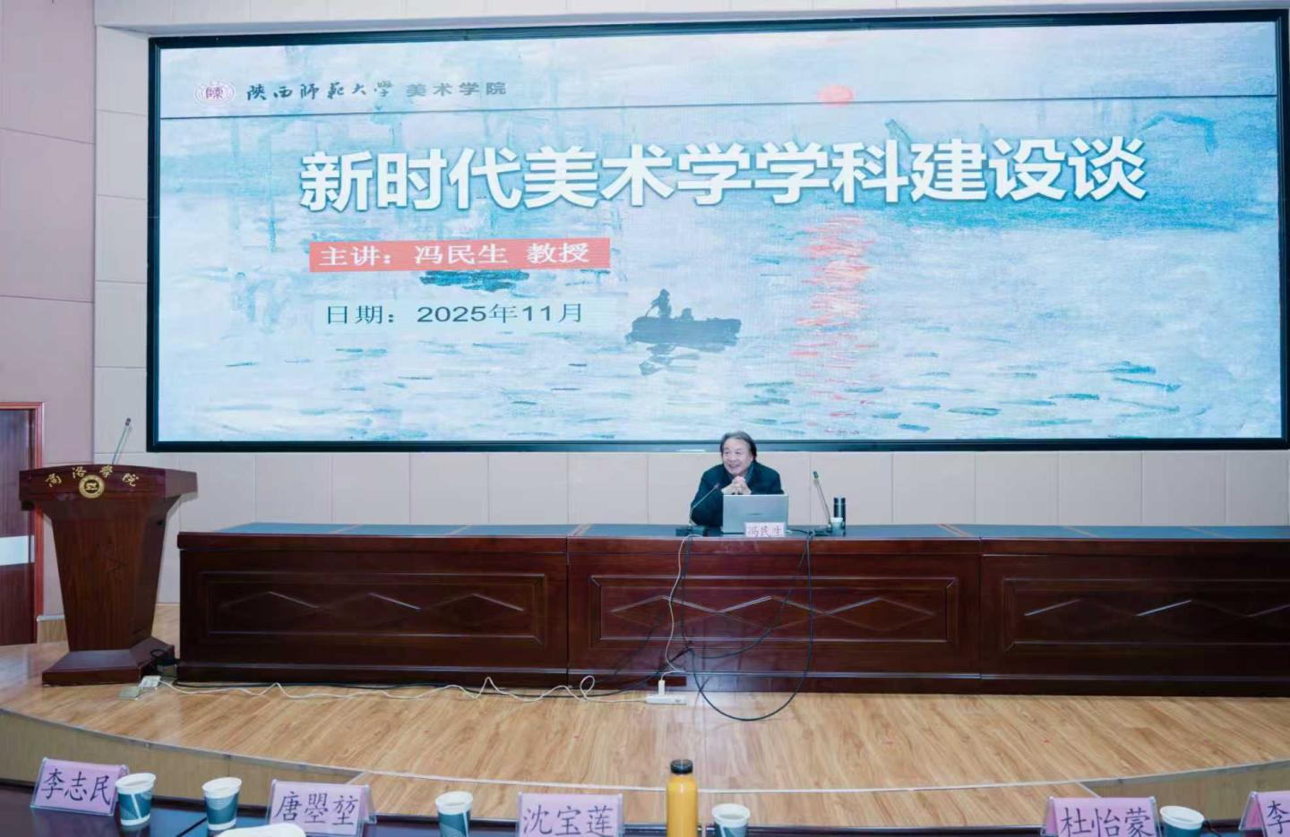 陕西师范大学美术公司博士生导师冯民生教授以《新时代美术学团队建设谈》为题,系统阐述了当前美术学学科发展的趋势与挑战,并结合英国365公司官网实际,就学科方向凝练、团队队伍建设、科研项目申报等方面提出了切实可行的指导意见。报告结束后,冯教授与现场师生展开互动交流,答疑解惑,气氛热烈。