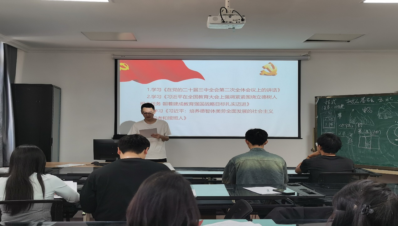 根据活动安排,主要围绕习近平总书记近期的三个重要讲话,集体领学,交流心得。首先,赵明豪同学带领学习了《习近平在党的二十届三中全会第二次全体会议上的讲话》,李芃辛同学带领学习《习近平在全国教育大会上强调紧紧围绕立德树人根本任务 朝着建成教育强国战略目标扎实迈进》,任泽瑞同学带领学习了《习近平:培养德智体美劳全面发展的社会主义建设者和接班人》。通过认真学习聆听与深入思考,大家对党的二十届三中全会精神的重要性、紧迫性的进一步理解有了新提升,对教育大会强调的围绕立德树人根本任务扎实推进教育强国、坚持五育并举培养合格建设者和可靠接班人的责任担当更加明确。