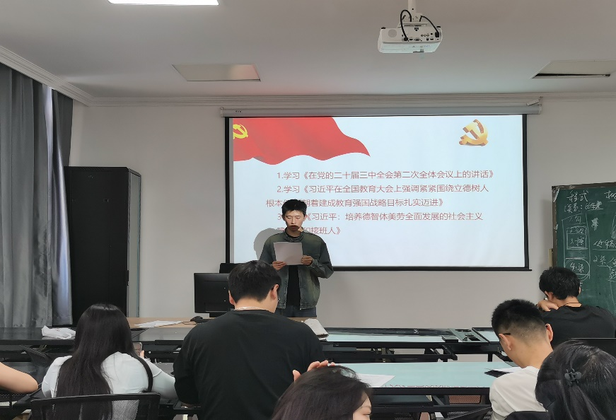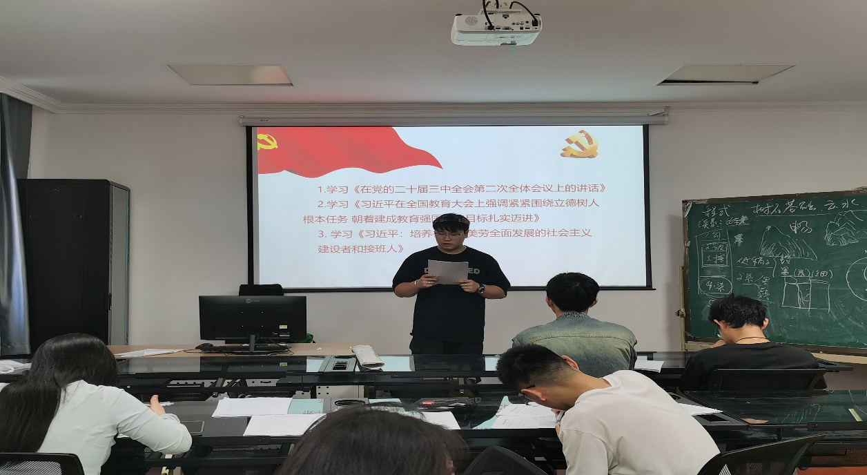 根据活动安排,主要围绕习近平总书记近期的三个重要讲话,集体领学,交流心得。首先,赵明豪同学带领学习了《习近平在党的二十届三中全会第二次全体会议上的讲话》,李芃辛同学带领学习《习近平在全国教育大会上强调紧紧围绕立德树人根本任务 朝着建成教育强国战略目标扎实迈进》,任泽瑞同学带领学习了《习近平:培养德智体美劳全面发展的社会主义建设者和接班人》。通过认真学习聆听与深入思考,大家对党的二十届三中全会精神的重要性、紧迫性的进一步理解有了新提升,对教育大会强调的围绕立德树人根本任务扎实推进教育强国、坚持五育并举培养合格建设者和可靠接班人的责任担当更加明确。