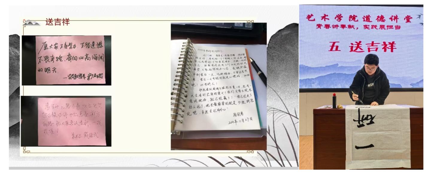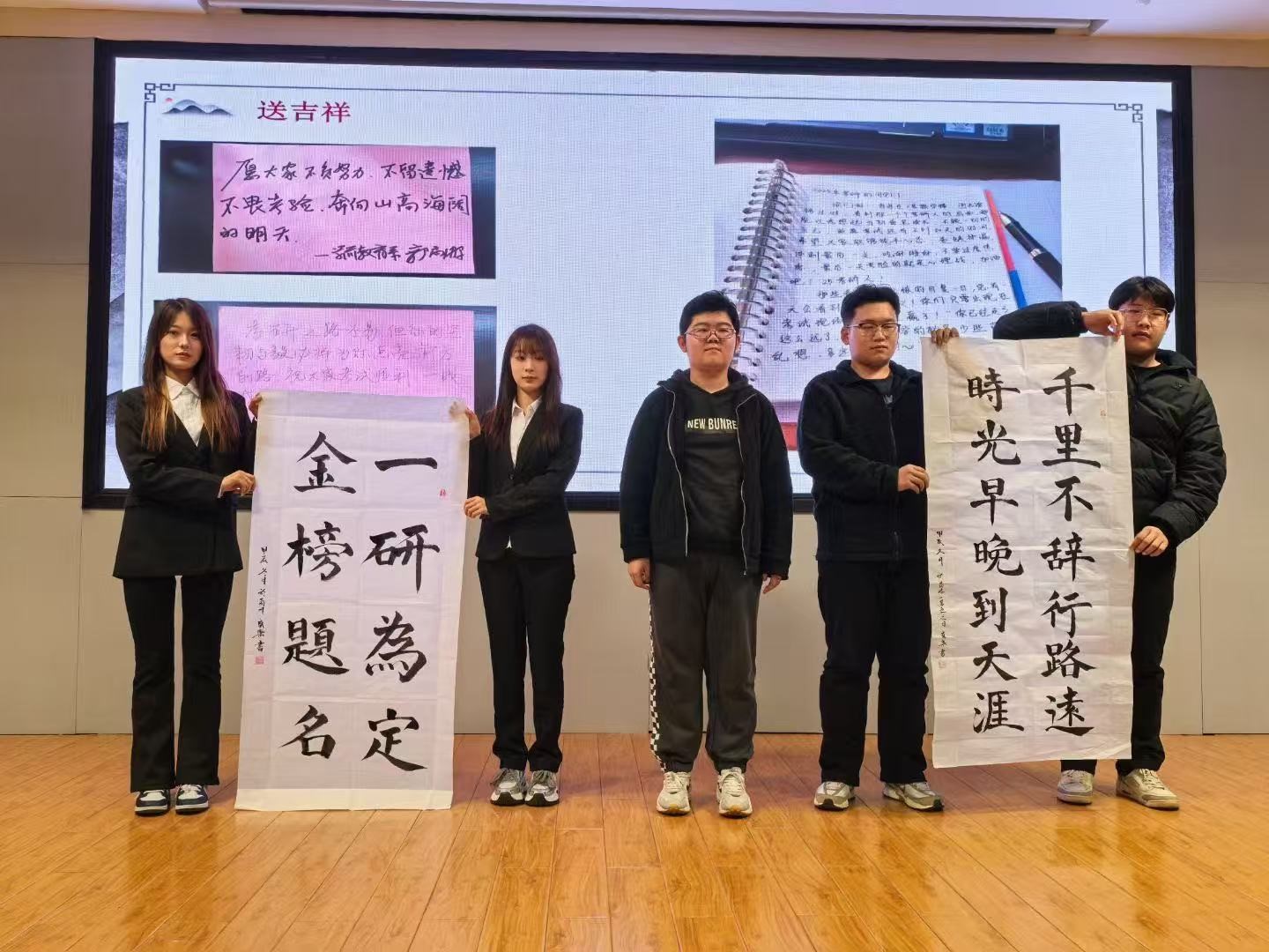 “送吉祥”环节,美术2204韩胜乐同学用以书法为现场师生和考研员工送祝福。同时,英国上市公司365三位系主任也鼓励考研员工在复习的最后关头坚定信心,祝愿大家一“战”成“硕”。