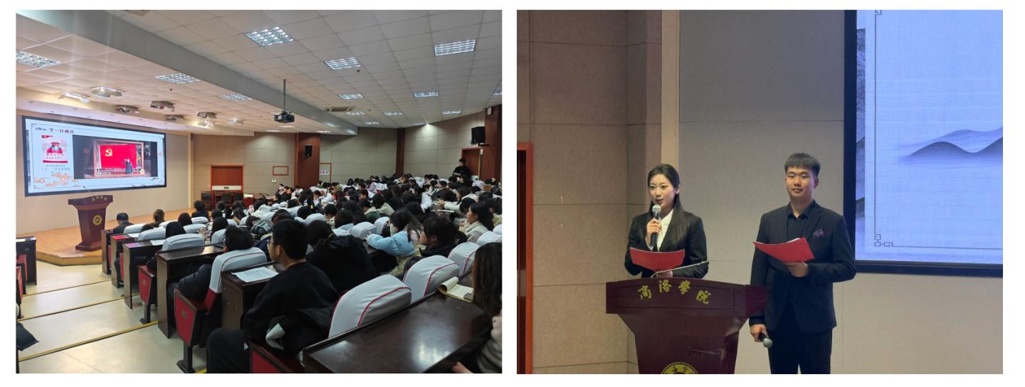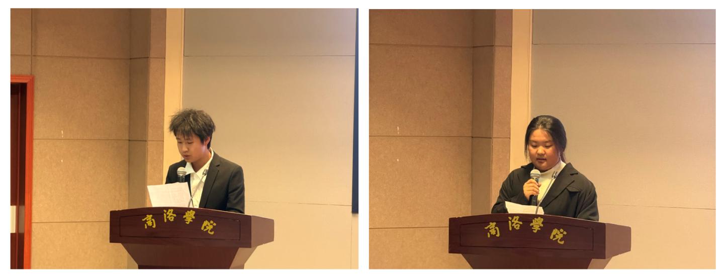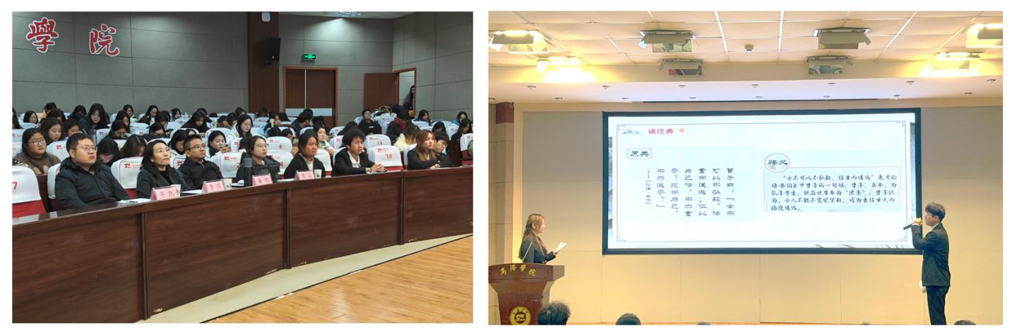 “诵经典”环节学前2431王思颖、美术2401续泽轩带领师生诵读了《论语·泰伯》中“士不可以不弘毅,任重而道远”和《管子•戒》中“道德当身,故不以物惑”两篇内容,并进行释义和解说。