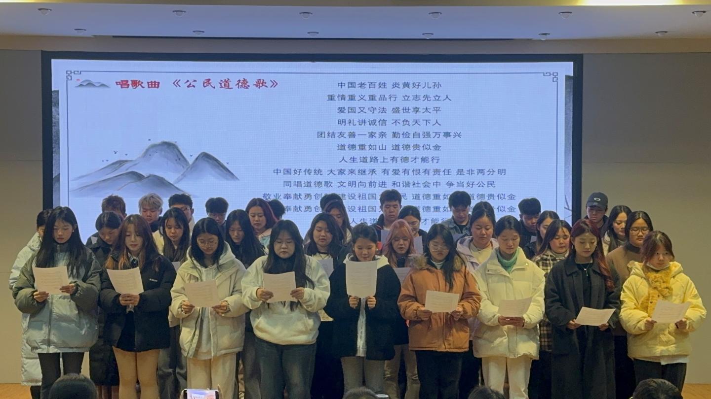 “唱歌曲”环节,音乐2401班全体同学作为代表,合唱《公民道德歌》,带领大家从歌曲中学习公民道德基本规范和具体要求。