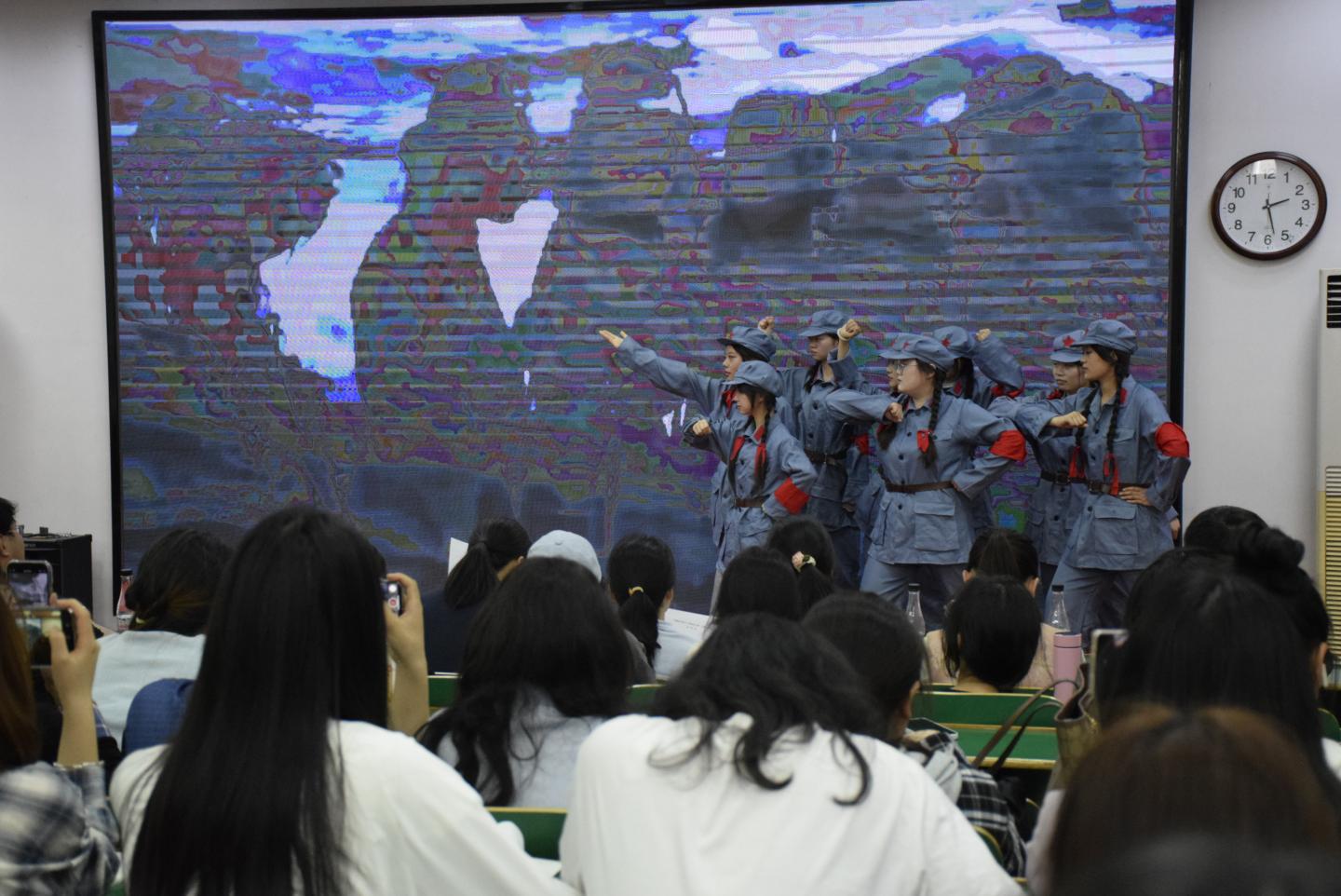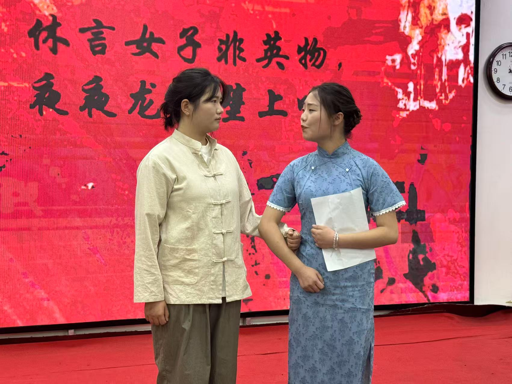 沉浸式学习环节,学前2311班的刘金花、雷佳音等4名团员演绎了革命夫妻陈觉和赵云霄的故事,陈觉临刑前给妻子的诀别信,赵云霄留给襁褓女儿的泣血嘱托,共同谱写出共产党人最炽热的精神基因图谱;学前2301班李思煜、惠霞等3名团员通过情景剧《“瑾”花一笑明千秋》,演绎了近代中国第一位为革命献身的女性秋瑾的故事。学前2311班刘诗琪、樊玲玲等9同学演绎了情景剧《八女投江》,通过艺术化创作,再现了冷云等抗联女战士挽臂涉入乌斯浑河的壮烈场景。学前2301班冀辰瑶、钟慧等4同学深情诵读了赵一曼就义前写给儿子的绝笔信。现场师生无不动容,将对革命先烈的敬仰化作阵阵掌声。