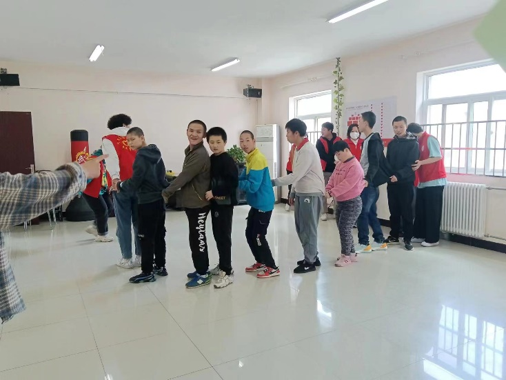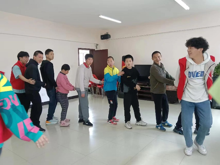 接着,大家一起进行老鹰捉小鸡的游戏。在活动中志愿者和学员们在“老鹰”面前连成长长的“小鸡”队伍,大家的心也像“小鸡”队伍一样连了起来在最纯净的心灵世界中享受着最纯真的快乐。