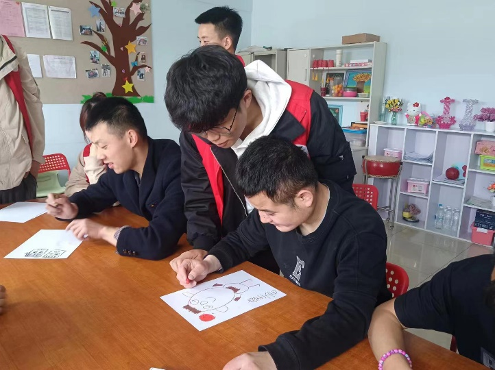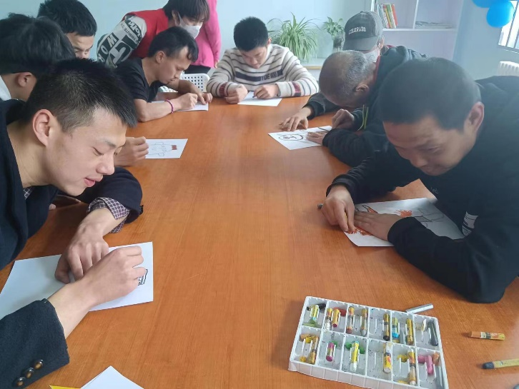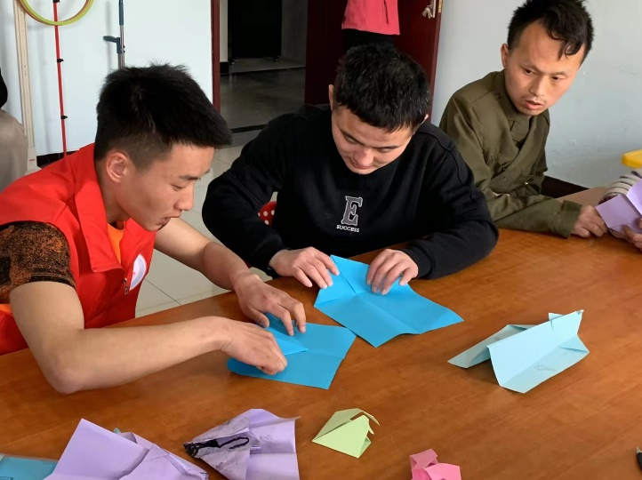 另一组由美术系同学组成。与大龄组的学员一起进行折纸和绘画。五彩斑斓的卡纸在学员们的手中变成飞机、兔子、大象等稚趣童真的折纸。绘画过程中学员们画出心中所想,他们丰富的内心世界画纸上展现了出来。