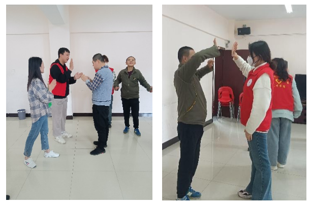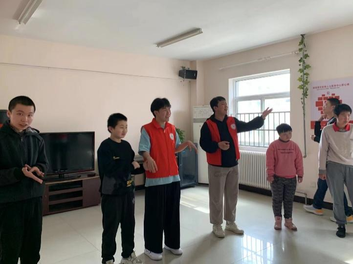 活动过程中,志愿者们被分为两组,一组由音乐系和学前系同学组成。带领小龄组的学员一起学习歌曲《学习雷锋好榜样》并引导学员学习手势舞,志愿者和学员们手牵手跟随音乐一起律动,大家脸上洋溢着开心的笑容。