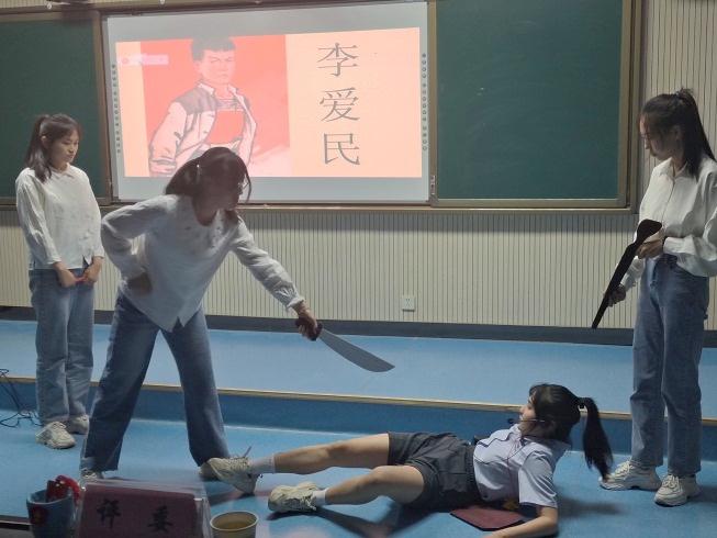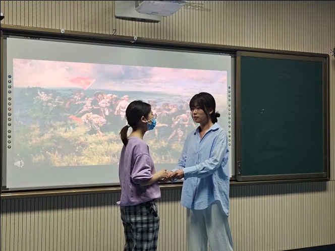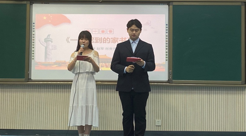 历史川流不息,精神代代相传。第三个党史故事《一封迟到的家书》讲述了革命先烈赵一曼同志不怕牺牲、英勇斗争,舍小家为大家的故事。从这个故事中也折射出抗战精神的内涵:天下兴亡、匹夫有责的爱国情怀,视死如归、宁死不屈的民族气节,把不畏强暴、血战到底的英雄气概,百折不挠、坚忍不拔的必胜信念。在故事结尾这封迟到的家书终于家人见面,同学们创造性地虚构了赵一曼和儿子重逢的感人情景,现场师生无不为红色精神血脉的传承而动容。