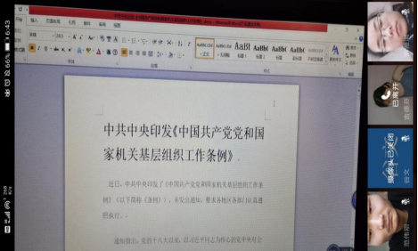 4月29日下午,员工第二党支部全体党员利用钉钉平台集体学习习近平总书记来陕考察重要讲话和《中国共产党党和国家机关基层组织工作条例》。